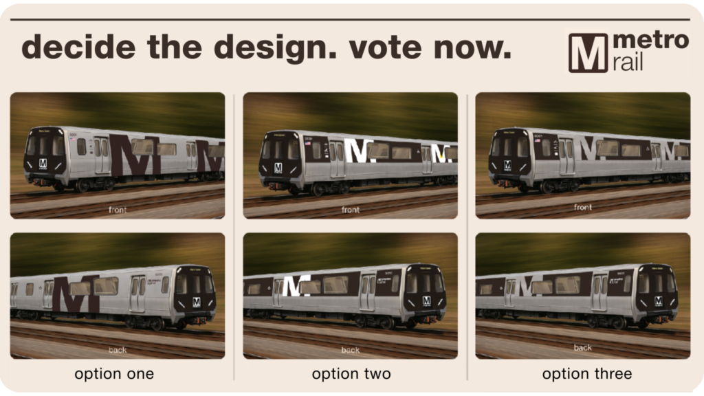 Metro está pidiendo la ayuda del público para finalizar el diseño exterior de su próxima flota ferroviaria de la serie 8000. El cliente ahora puede votar por una de las tres opciones de diseño. aquí.