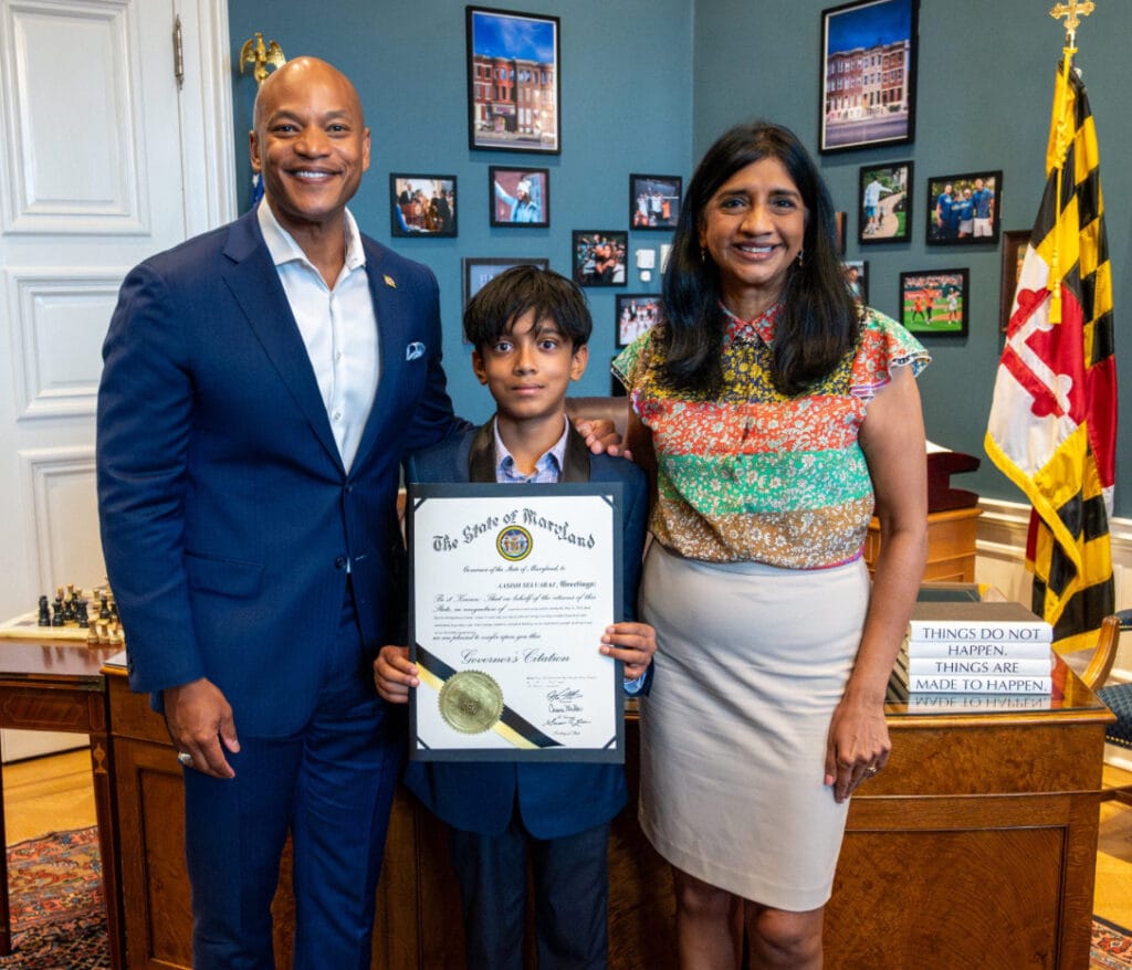 Los principales funcionarios de Maryland, el gobernador Wes Moore y el vicegobernador Aruna Miller, entregaron una mención del gobernador a Aasish Selvaraj, de 12 años de Montgomery County, en reconocimiento a su extraordinaria valentía durante un rescate por inundación repentina el mes pasado en Bethesda.