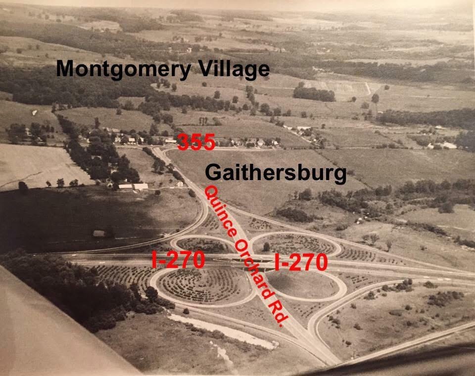 La foto ofrece un contexto fascinante para los residentes actuales, con etiquetas que indican cómo se llaman las carreteras hoy en día (Quince Orchard Rd., I-270, 355h). Cabe destacar que la imagen muestra el trazado original del intercambio en forma de trébol, gran parte del cual se eliminó posteriormente para crear el aparcamiento disuasorio y una nueva entrada en dirección sur desde Clopper Road. También se ve la zona que se convertiría en el centro comercial Lakeforest, ubicada sobre la Ruta 355 en la foto.