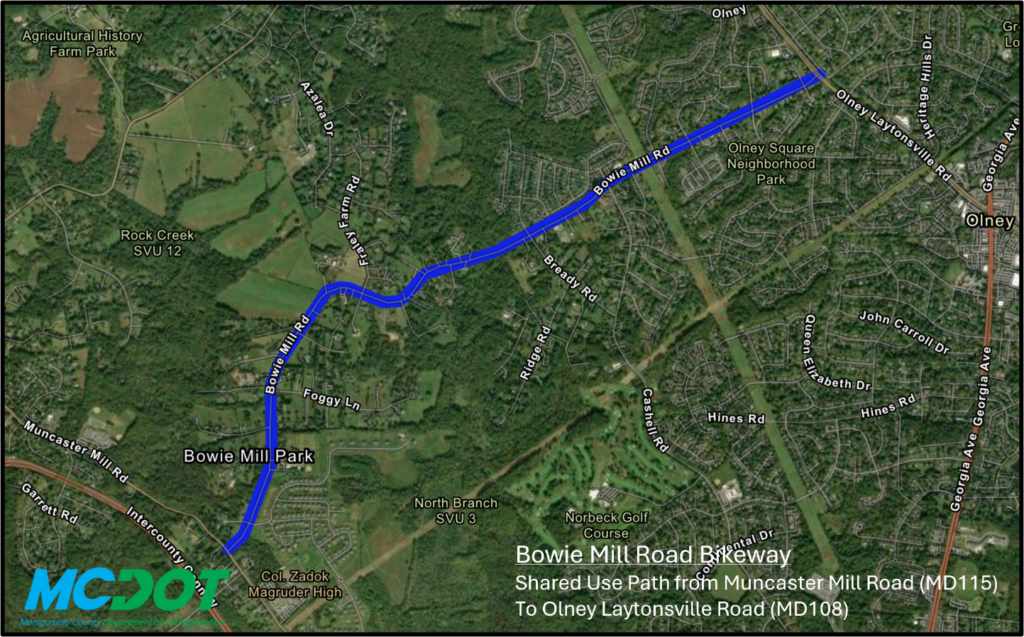 El martes 16 de septiembre, de 7 a 9 p. m., el Departamento de Transporte de Montgomery County (MCDOT) llevará a cabo una jornada de puertas abiertas para discutir el propuesto carril bici de Bowie Mill Road ubicado en Derwood.