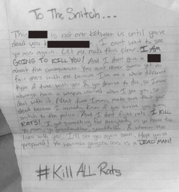 Mientras estaba en prisión, en abril de 2025, Wilkinson envió cartas a la víctima del apuñalamiento y a un familiar. La carta comenzaba con “Al soplón” y terminaba con “#TODAS LAS RATAS MUEREN”. La carta incluía la declaración “¡VOY A MATARTE!”. Wilkinson fue acusado de represalia contra testigos en julio de 2025 y se declaró culpable el 11 de septiembre de 2025. Hoy, el juez Ayres le impuso el tiempo restante en suspenso de su condena por el caso de intento de asesinato y condenó a Wilkinson a 15 años consecutivos adicionales por represalia contra testigos.