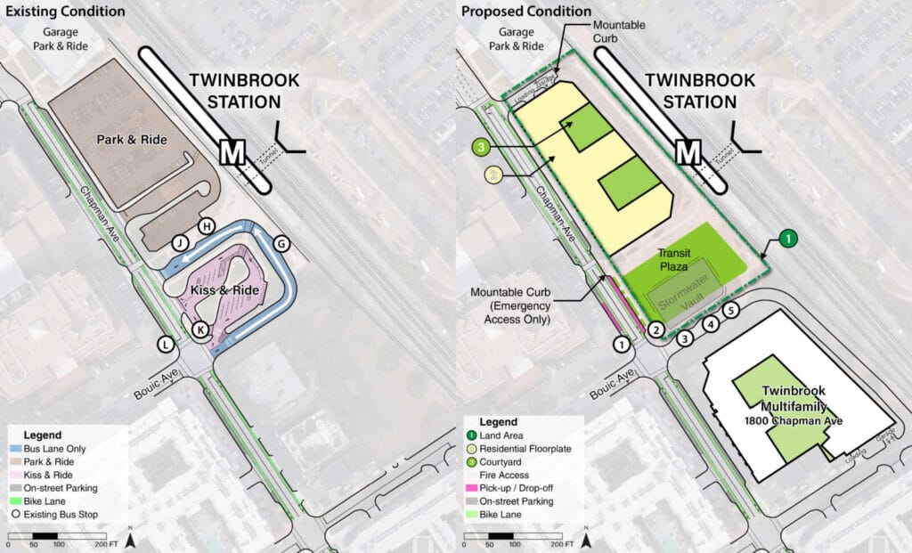 Para WMATAMetro propone reubicar el bucle de autobuses, tres dársenas, las instalaciones de Kiss & Ride y eliminar el aparcamiento disuasorio en las instalaciones de transporte público del lado oeste de la estación Twinbrook. El estacionamiento elevado actual de 418 plazas al norte y las instalaciones de estacionamiento del lado este permanecerán sin modificaciones. Las modificaciones a las instalaciones de transporte público se realizarán en coordinación con el futuro promotor conjunto de Metro, que se seleccionará mediante una futura convocatoria.