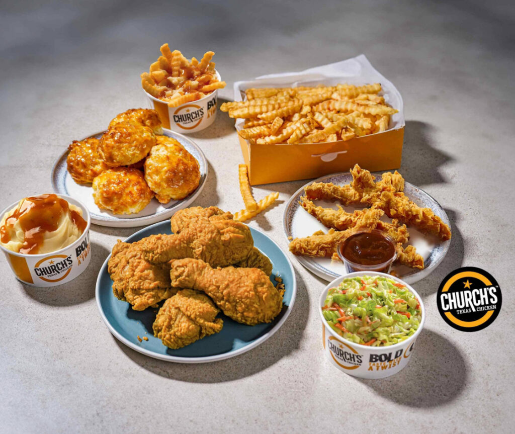 Church’s Chicken es conocido por su pollo frito rebozado y empanizado a mano, así como por sus populares guarniciones, como las galletas de miel y mantequilla, el puré de papas y el quimbombó frito. Si bien en Estados Unidos se le conoce como Church’s Texas Chicken, la marca suele operar bajo el nombre Texas Chicken en los mercados internacionales.