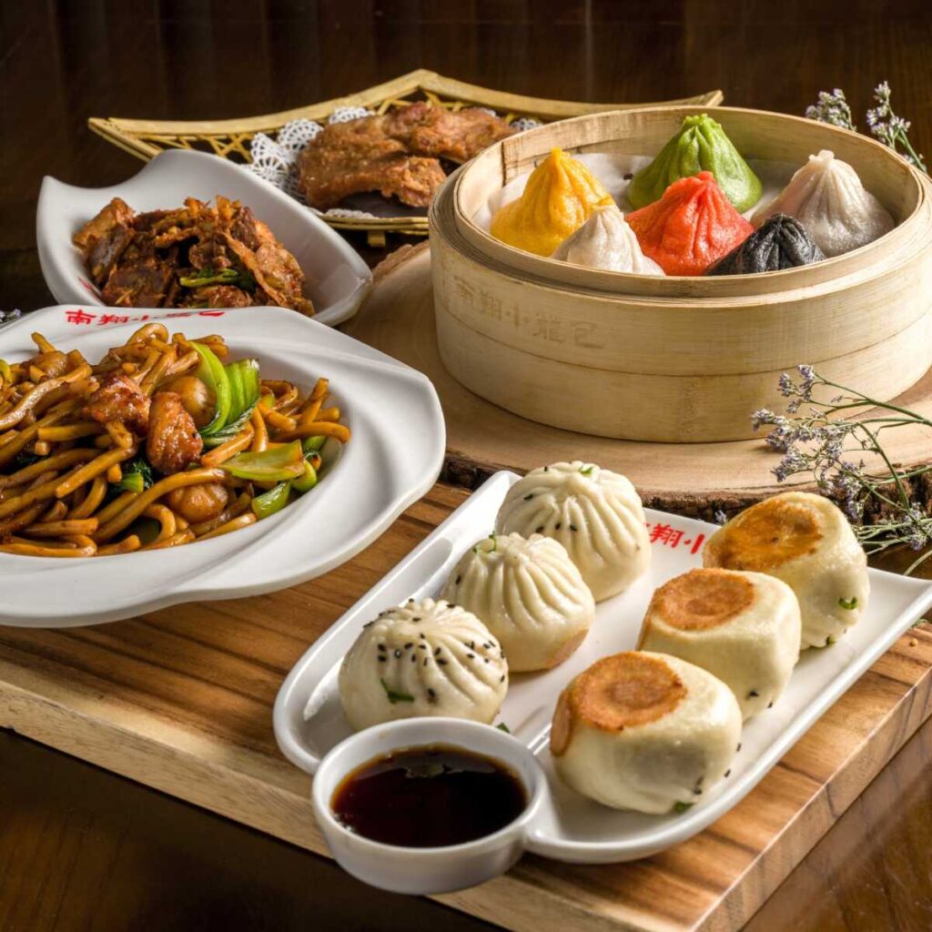 El menú ofrece una amplia selección de dumplings para sopa, incluyendo de cerdo, pollo y cangrejo con cerdo, así como variantes especiales con trufa, vieira, jamón y abulón. Los comensales pueden probar degustaciones como los Seis de la Suerte y los Tres Tesoros, además de platos fríos como el Pollo en Salsa de Vino, platos favoritos de fideos como la Sopa de Fideos con Carne Estofada, opciones de arroz y pastel de arroz, sopas y postres como el Bao de Ube y Frijoles Rojos.