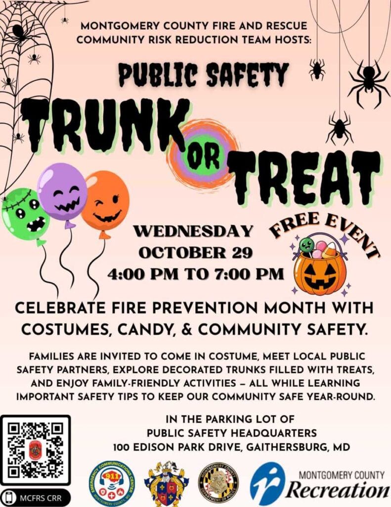 Según MCFRS: “El Equipo de Reducción de Riesgos Comunitarios (CRR) del Servicio de Bomberos y Rescate Montgomery County se complace en invitar a la comunidad a nuestro Seguridad Pública: Baúl o Dulceevento en elMontgomery County Sede de Seguridad Pública!