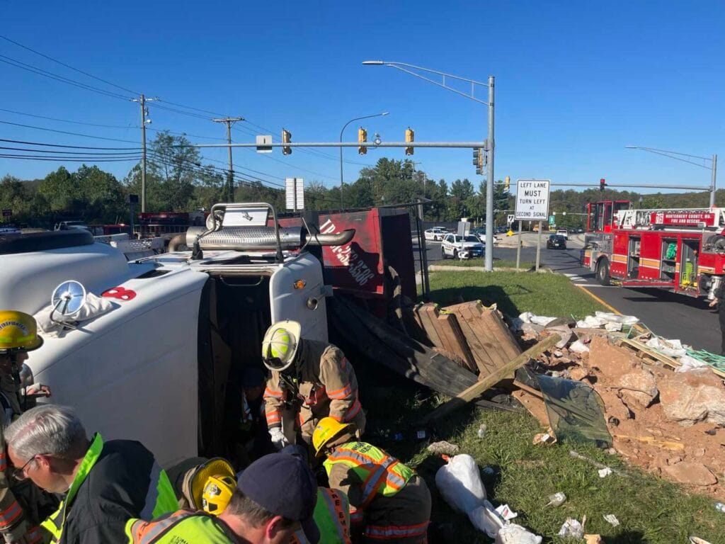 Montgomery County Los Servicios de Bomberos y Rescate (MCFRS) respondieron a una colisión que involucró a un camión volquete volcado cerca de la cuadra 14700 de Layhill Road por el ICC (MD 200) el jueves por la tarde.