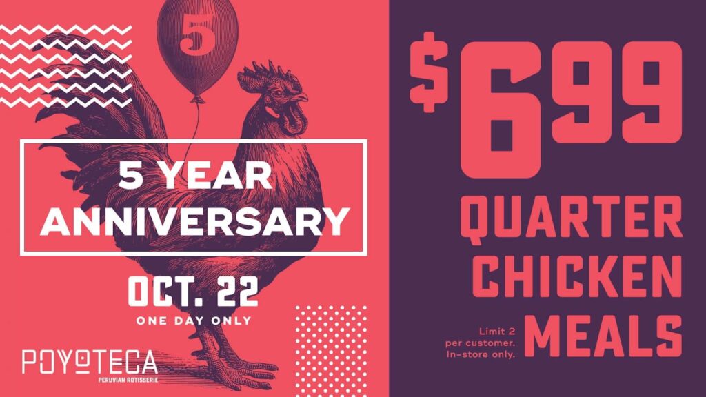 Poyoteca Peruvian Rotisserie celebra su quinto aniversario en Rockville con una promoción especial de un día que lleva su exclusivo pollo asado a la comunidad a un precio inmejorable. El restaurante ofrecerá comidas de un cuarto de pollo por solo $6,99 el miércoles 22 de octubre (solo en la tienda ubicada en Rockville).