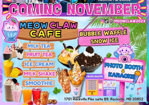 Meow Claw, conocido por su colorida selección de postres, bebidas y juegos de garra, se expande con una segunda sucursal en 1701 Rockville Pike, Suite B9, en The Shops at Congressional Village. El nuevo Meow Claw Café abrirá en noviembre y ofrecerá waffles de burbujas, granizados, smoothies, té con leche y malteadas, además de un fotomatón y una zona de karaoke.