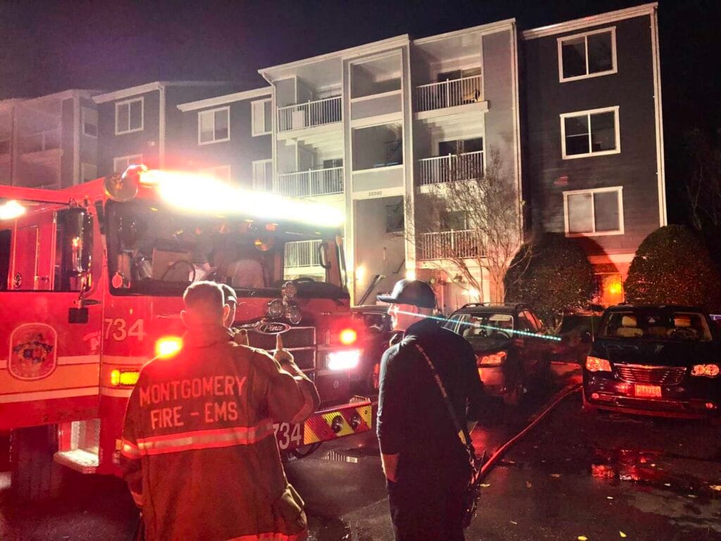 Según el oficial de información pública de MCFRS, Pete Piringer, los bomberos llegaron y encontraron humo en el pasillo del edificio residencial de cuatro pisos, que no contaba con rociadores. La llamada inicial se recibió por la activación de una alarma de humo y la presencia de humo visible en el pasillo. Tras la inspección, los equipos descubrieron un incendio en la cocina de una vivienda desocupada del cuarto piso.