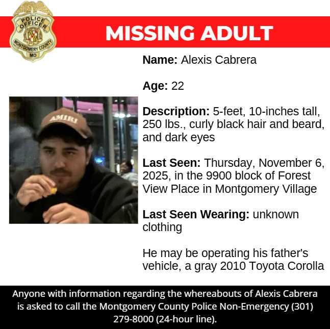 Cualquier persona que tenga información sobre el paradero de Alexis Cabrera debe comunicarse con la línea de no emergencia de la policía Montgomery County al (301) 279-8000. Las llamadas pueden permanecer anónimas.