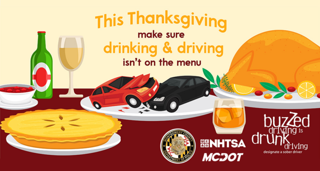Según el comunicado de prensa: “El Departamento de Transporte de Montgomery County (MCDOT), el Departamento de Policía de Montgomery County (MCPD) y los Servicios de Bebidas Alcohólicas de Montgomery County (ABS) advierten a los residentes antes del feriado de Acción de Gracias que planifiquen su noche y no conduzcan si eligen celebrar con alcohol o han consumido cannabis.