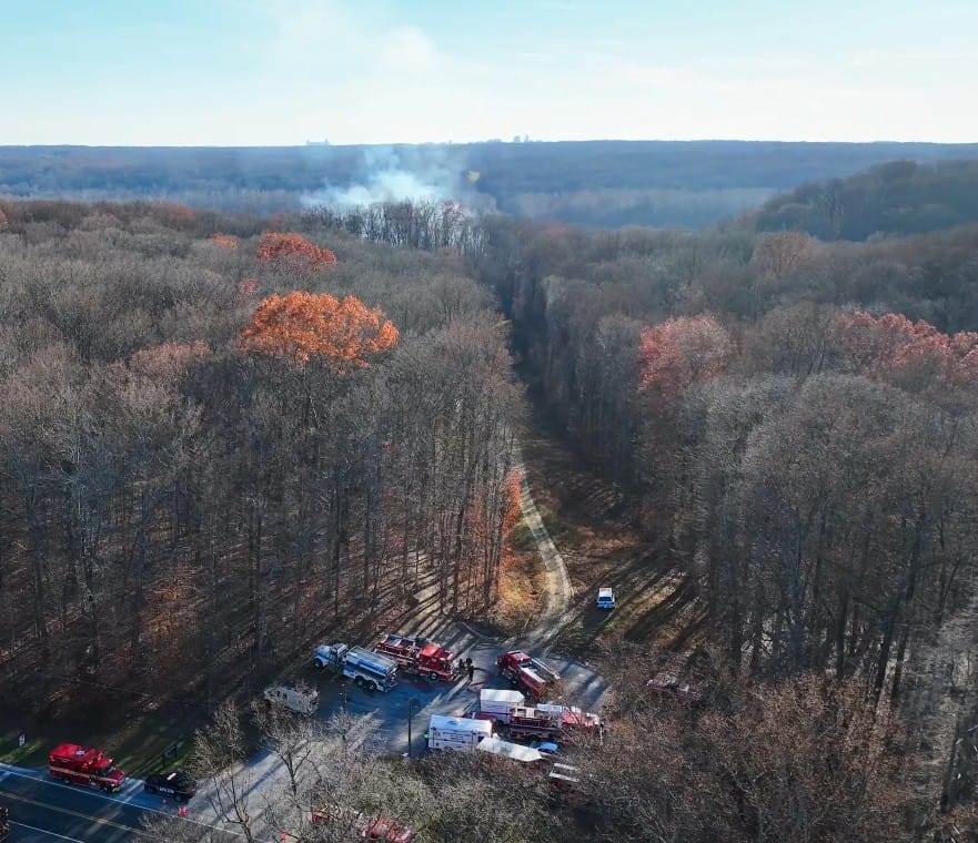 Montgomery County Los Servicios de Bomberos y Rescate (MCFRS) respondieron alrededor de las 12:30 p. m. del sábado a un gran incendio de maleza y bosques en un área remota de Blockhouse Point Park, detrás de una estación de bombeo de agua WSSC en River Road.