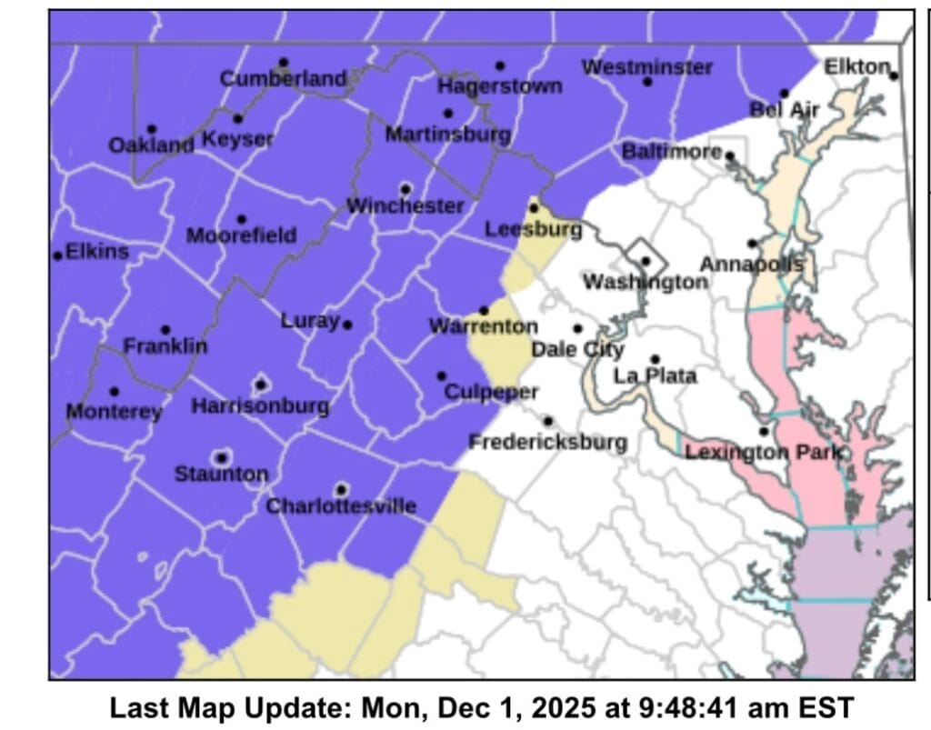 Los meteorólogos del Servicio Meteorológico Nacional (NWS) indican que se desarrollarán precipitaciones después de la medianoche, extendiéndose del suroeste al noreste. Si bien se espera que el sistema comience con nieve en toda la zona, es probable que se produzca una transición a aguanieve y lluvia helada en la mayoría de las localidades a medida que las temperaturas suban durante la mañana. Se espera que las zonas a lo largo y al sur de la US-50 y la I-66 terminen con lluvia, mientras que las regiones cercanas a la línea Mason-Dixon tienen la mayor probabilidad de permanecer completamente cubiertas de nieve, aunque esto aún es incierto.