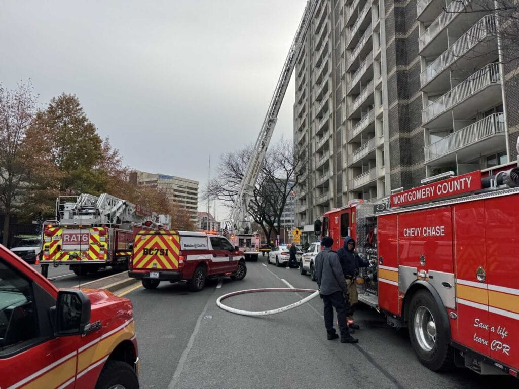 Montgomery County Los Servicios de Bomberos y Rescate respondieron el lunes por la mañana tarde a un incendio de gran altura en los apartamentos Highland House, ubicados en 5480 Wisconsin Avenue en Friendship Heights. MCFRS inicialmente informó humo denso en el piso 15, lo que confirmó un incendio activo dentro de un apartamento mientras los equipos trabajaban para controlar el incendio.