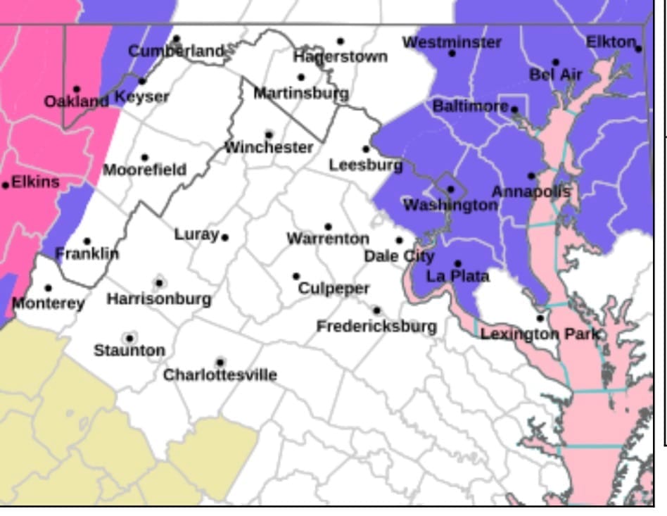 Un aviso de clima invernal ahora está vigente para el Distrito de Columbia y gran parte del centro y norte de Maryland, incluido Montgomery County, así como partes del norte de Virginia, con nieve prevista durante la noche hasta la madrugada del domingo.