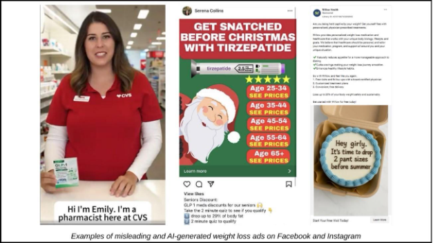 A menudo, estos anuncios utilizan contenido generado por IA sin etiquetar, incluyendo imágenes falsas de antes y después y portavoces inexistentes. Un anuncio muestra a una modelo generada por IA perdiendo 93 kilos en tres semanas. Otros utilizan agentes del orden, enfermeras y farmacéuticos falsos, creados por IA, para respaldar sus afirmaciones de pérdida de peso.