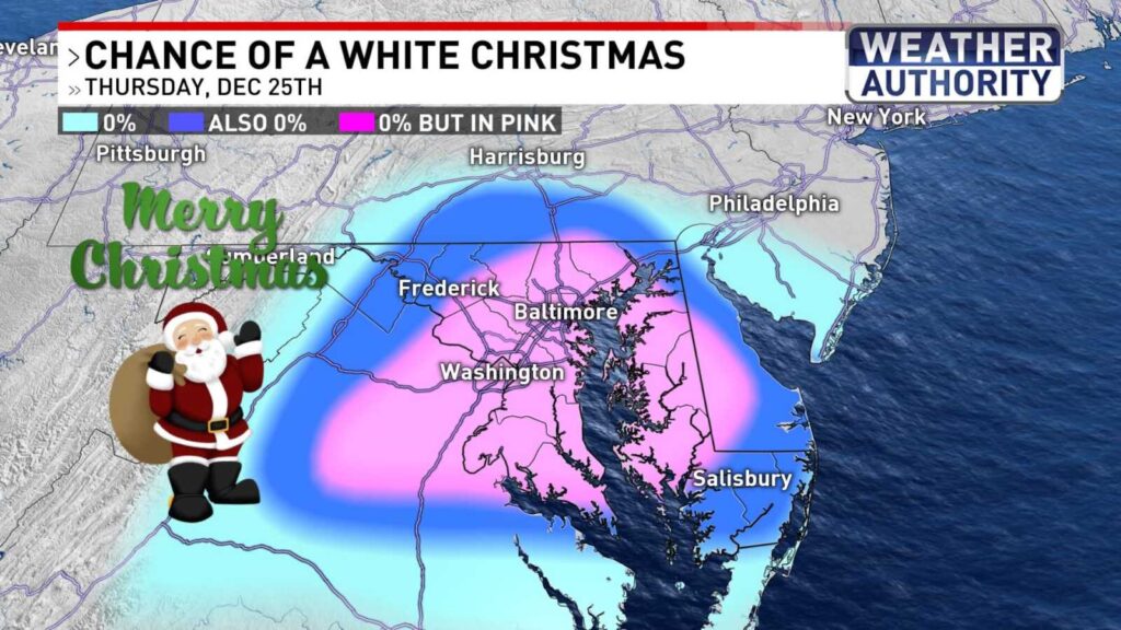 A primera vista, el mapa luce festivo, con toques de azul, rosa y verde azulado que cubren gran parte de Maryland y el norte de Virginia (incluyendo las áreas metropolitanas de Washington D. C. y Baltimore). Sin embargo, al observarlo con más atención, se descubre la gracia: cada color de la leyenda representa un cero por ciento de probabilidad de nieve. Una sección incluso indica “0% pero en rosa”, lo que deja claro que el pronóstico indica que no nevará el día de Navidad.