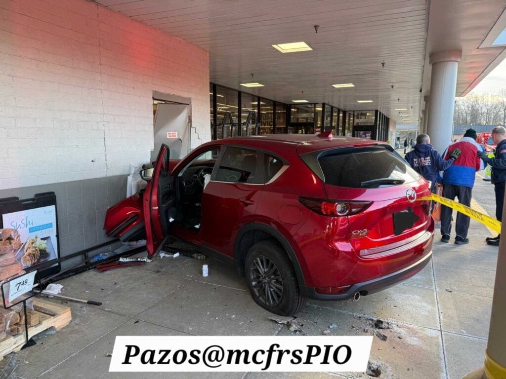 Un conductor se estrelló contra la tienda de comestibles Giant Food en Leisure World el domingo por la tarde, lo que provocó la respuesta de los equipos del Servicio de Bomberos y Rescate de Montgomery County.