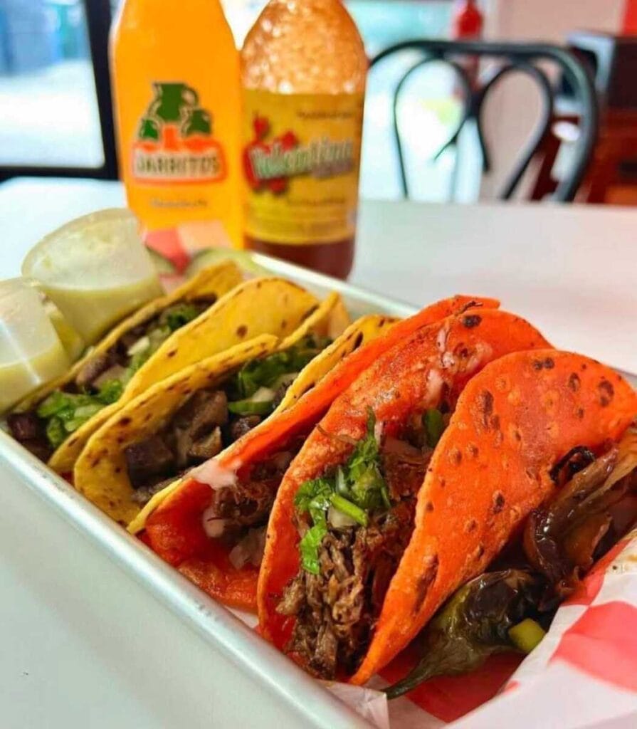 El menú incluye tacos de birria con consomé como plato estrella, junto con tortas, burritos, enchiladas, esquite y otros platos callejeros mexicanos.