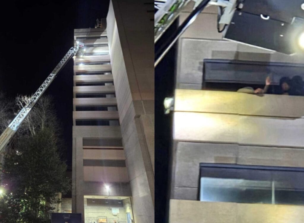 Un rescate se desarrolló la madrugada del jueves 1 de enero, después de que un intento de robo a mano armada obligara a dos hombres a subir a una estrecha cornisa exterior nueve pisos por encima del suelo en el Embassy Suites Hotel, ubicado en 6711 Democracy Boulevard en Bethesda.