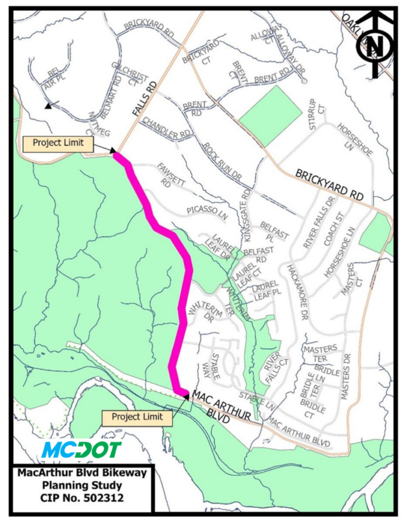 El Estudio de Planificación de la Ciclovía del Bulevar MacArthur ofrecerá dos opciones para senderos de uso compartido de 3 metros a lo largo del Bulevar MacArthur, comenzando en Old Anglers Inn y siguiendo hacia el norte hasta la intersección del Bulevar MacArthur y Falls Road. Se han desarrollado planes conceptuales del 5% para ambas opciones.