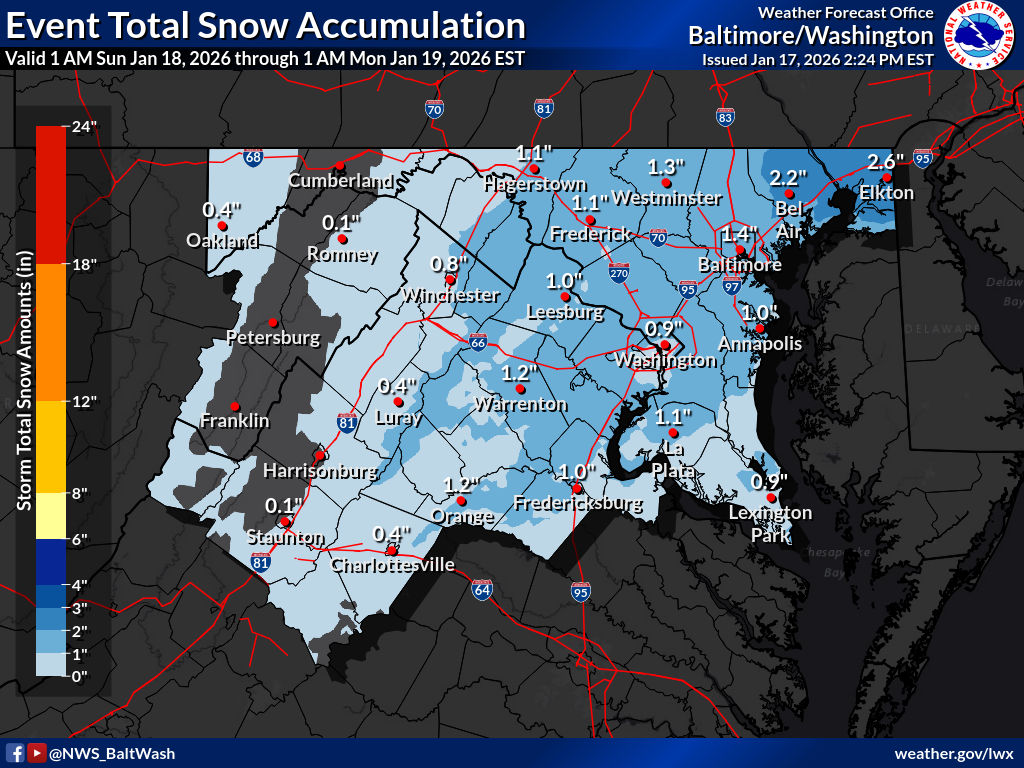 Según la oficina del Servicio Meteorológico Nacional de Baltimore/Washington, las precipitaciones comenzarán en el centro-sur de Virginia a última hora de esta noche, extendiéndose hacia el este y el norte, en dirección al corredor de la I-95, antes del amanecer del domingo. Se espera que la mayoría de las zonas presenten una capa de nieve derretida de hasta 2,5 cm (1 pulgada), con totales localmente más altos posibles en el noreste de Maryland.