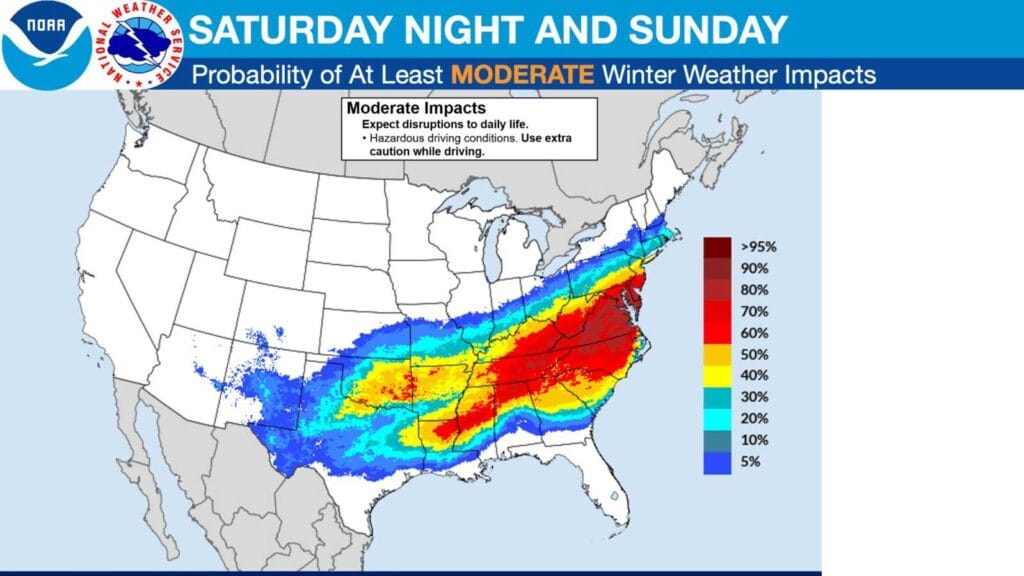 El Servicio Meteorológico Nacional, oficina de Baltimore/Washington, informa que aumenta la probabilidad de una importante tormenta invernal que afectará la región del sábado al domingo. Las previsiones actuales indican una amenaza moderada de tormenta invernal en gran parte del área, incluyendo el corredor de la I-95, con la posibilidad de nevadas generalizadas e impactantes.