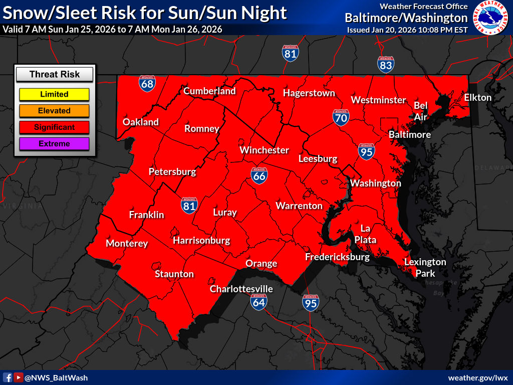 Thomas señaló que, durante las últimas 24 horas, los datos de la Combinación Nacional de Modelos (utilizada por el Servicio Meteorológico Nacional) han mostrado un mayor total de nevadas, impulsado más por la consolidación entre los miembros del modelo que por una marcada tendencia al alza. Esta agrupación aumenta la confianza en un resultado más favorable. Añadió que se ha observado un ligero desplazamiento hacia el norte al final de las pasadas, lo que podría acercar a Washington D. C. a la zona de mayor riesgo, aunque un desplazamiento demasiado pronunciado hacia el norte introduciría aire más cálido en altura y aumentaría el riesgo de mezcla con aguanieve.