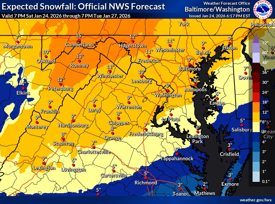 El NWS estima que la mayor parte del área metropolitana de Washington D. C. acumulará entre 23 y 25 cm de nieve. Se pronostica que las zonas al sur de Washington registrarán totales ligeramente inferiores, de entre 18 y 20 cm, mientras que las zonas al norte de Montgomery County podrían recibir entre 28 y 30 cm de nieve.