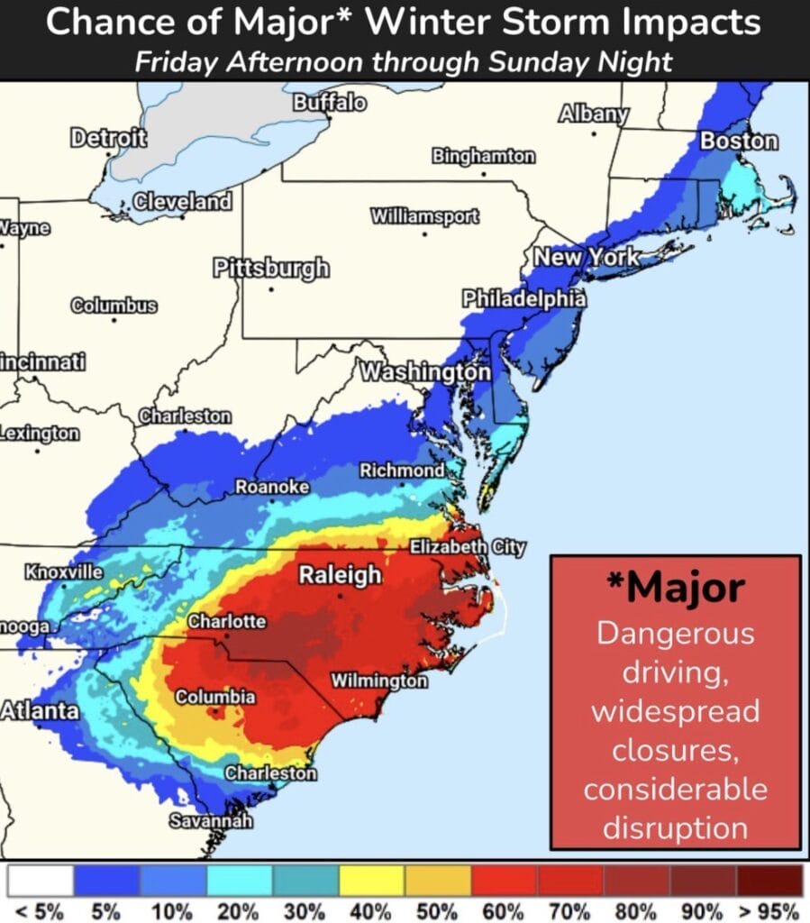 Según el Servicio Meteorológico Nacional (NWS), la tormenta se intensificará rápidamente cerca de la costa de Carolina del Norte desde el viernes por la noche hasta el sábado por la noche. Se esperan fuertes nevadas generalizadas y vientos fuertes desde el sur de los Apalaches, pasando por las Carolinas y hasta el sur de Virginia, donde el riesgo de más de veinte centímetros de nieve supera el 50 % en algunas zonas.
