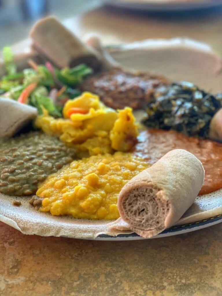 Uno de los platos más recomendados del menú es el Veggie Combo, un colorido plato que incluye lentejas, garbanzos, berza y repollo. Los platos de carne también son destacados, en particular el Derek Tibs, con carne de res salteada y seca, y el Special Beef Kitfo, servido con queso casero y gomen.