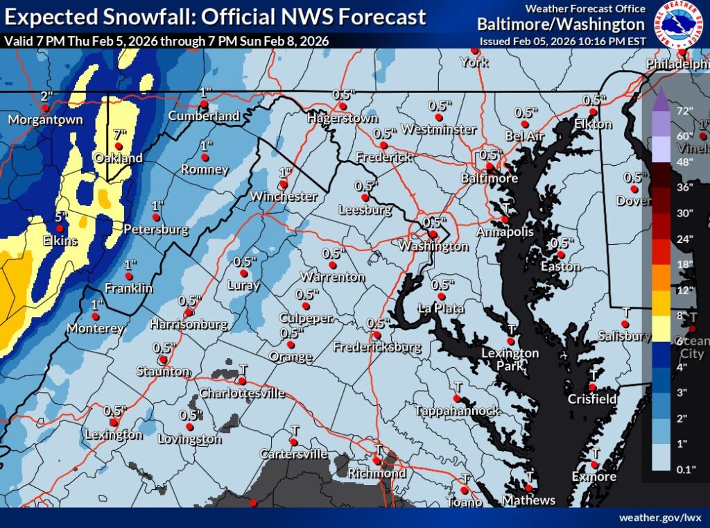 Según el Servicio Meteorológico Nacional (NWS), se mantiene una alerta de frío extremo desde la noche del viernes hasta la mañana del domingo. Se esperan temperaturas de entre 0 y 15 grados bajo cero en Washington, D. C., gran parte de Maryland, el norte y el oeste de Virginia, y el este de Virginia Occidental. Se espera que la sensación térmica se mantenga en o por debajo de cero grados durante gran parte del día del sábado debido a los fuertes vientos y las bajas temperaturas.