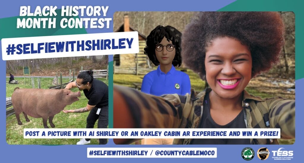 Montgomery County está promocionando un concurso por el Mes de la Historia Negra en el Museo Afroamericano Oakley Cabin en Brookeville que alienta a los visitantes a tomarse y compartir selfies con “AI Shirley”, una intérprete virtual de inteligencia artificial, para tener la oportunidad de ganar tarjetas de regalo.