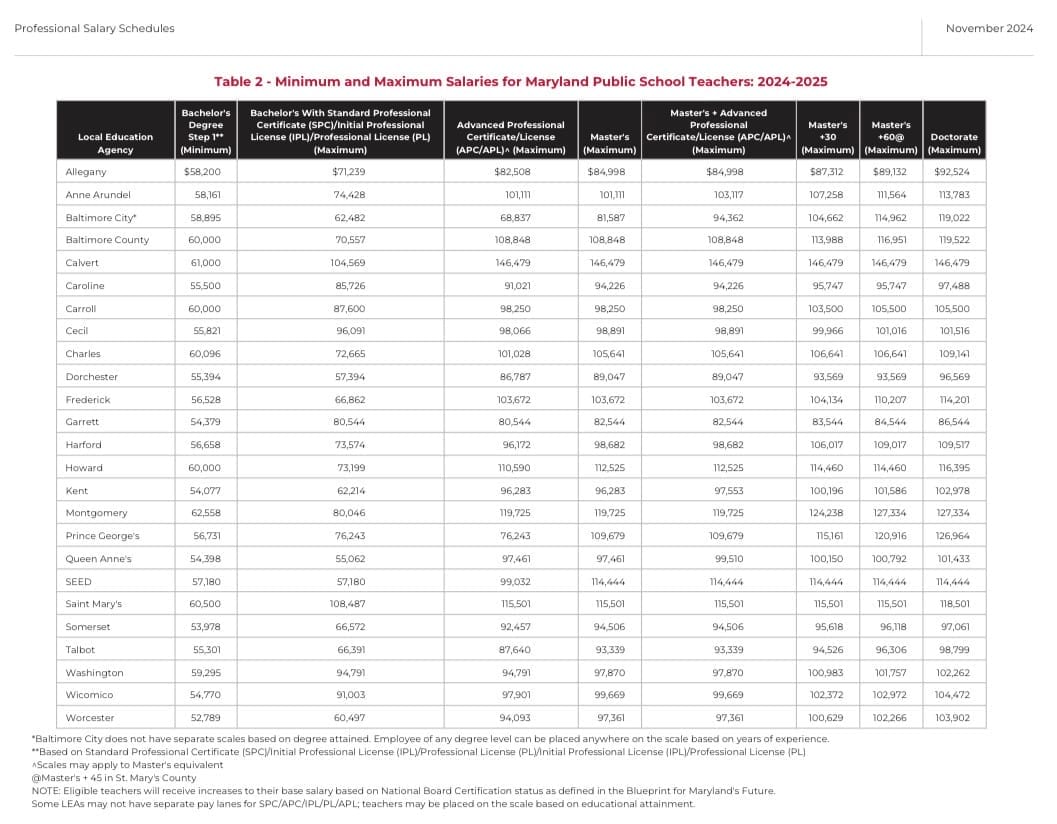 Adelantándonos al año escolar 2024-2025 (el año pasado, pero la última versión disponible para todos los condados Maryland en el sitio web del MSDE), la escala ha cambiado por completo. Un maestro principiante con una licenciatura en Montgomery County ahora gana poco más de $62,000. En el tope de las escalas salariales actuales, los maestros con experiencia y títulos avanzados pueden ganar hasta seis cifras, con un salario máximo en algunos condados Maryland que supera los $120,000 y, en el condado de Calvert, supera los $140,000.