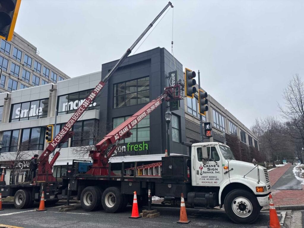 La antigua tienda de comestibles Amazon Fresh en Friendship Heights retiró su señalización exterior permanente del edificio el lunes, luego del cierre nacional de Amazon de sus tiendas de comestibles Amazon Fresh y Amazon Go a principios de este mes.