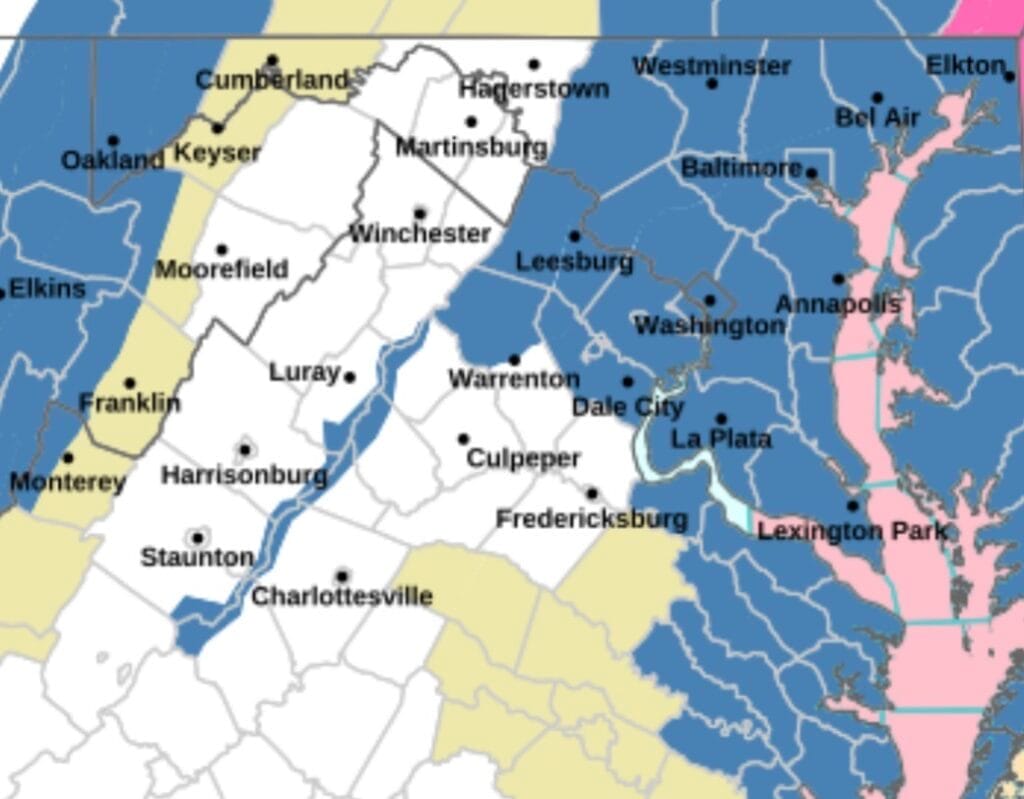 Según el Servicio Meteorológico Nacional, es posible que se produzcan fuertes nevadas en el Distrito de Columbia y en partes del centro y sur de Virginia, así como en el centro y norte de Virginia. Los meteorólogos prevén acumulaciones totales de nieve de 12,7 cm o más, con ráfagas de viento de hasta 56 km/h.