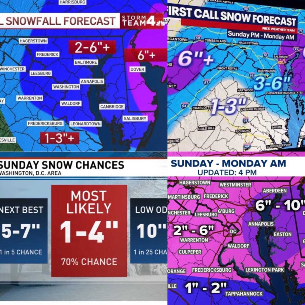El pronóstico inicial de NBC4 sitúa gran parte del área en un rango de 2 a 6 pulgadas o más, con totales más altos posibles al este del área metropolitana. FOX5 es bastante similar, mostrando totales generalizados de 3 a 6 pulgadas en gran parte del centro de Maryland y el norte de Virginia. WUSA9 también sitúa la mayor parte de la región en un rango de 2 a 6 pulgadas, en estrecha sintonía con NBC4 y FOX5.