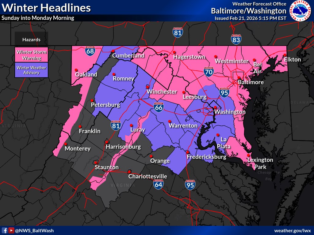 - Siga las cuentas de redes sociales del Departamento de Gestión de Emergencias Maryland y del Servicio Meteorológico Nacional regional para obtener pronósticos localizados.