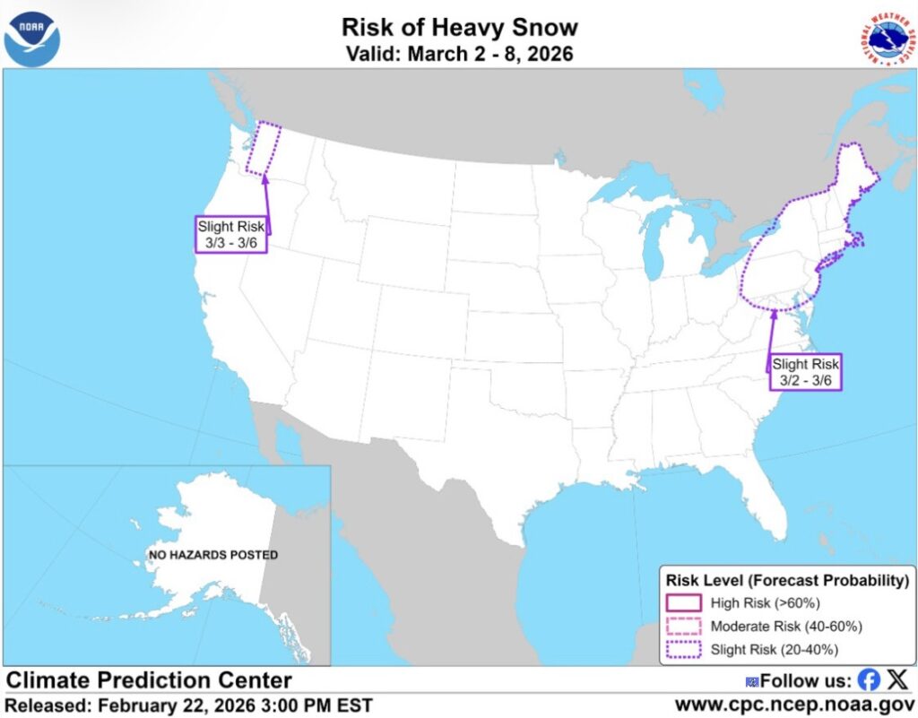 El Centro de Predicciones Climáticas del Servicio Meteorológico Nacional ha incluido la mayor parte de Maryland en una zona de “Riesgo Leve de Fuertes Nevadas” para el período del 2 al 8 de marzo, poniendo a principios de marzo en el radar para un posible clima invernal. Sin embargo, esa perspectiva se recibe con cierto escepticismo a nivel local.