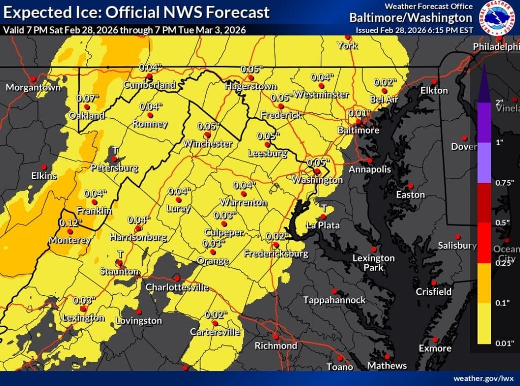 Las previsiones actuales sugieren que las acumulaciones de hielo serán, en general, ligeras. Las cantidades de hielo pronosticadas en la región de Baltimore-Washington rondan, en su mayoría, unas pocas centésimas de pulgada, con posibles totales ligeramente superiores al oeste del área metropolitana y en zonas de mayor altitud. La principal preocupación sería la formación de hielo leve en superficies elevadas, como árboles, líneas eléctricas, puentes y carreteras sin acondicionar.