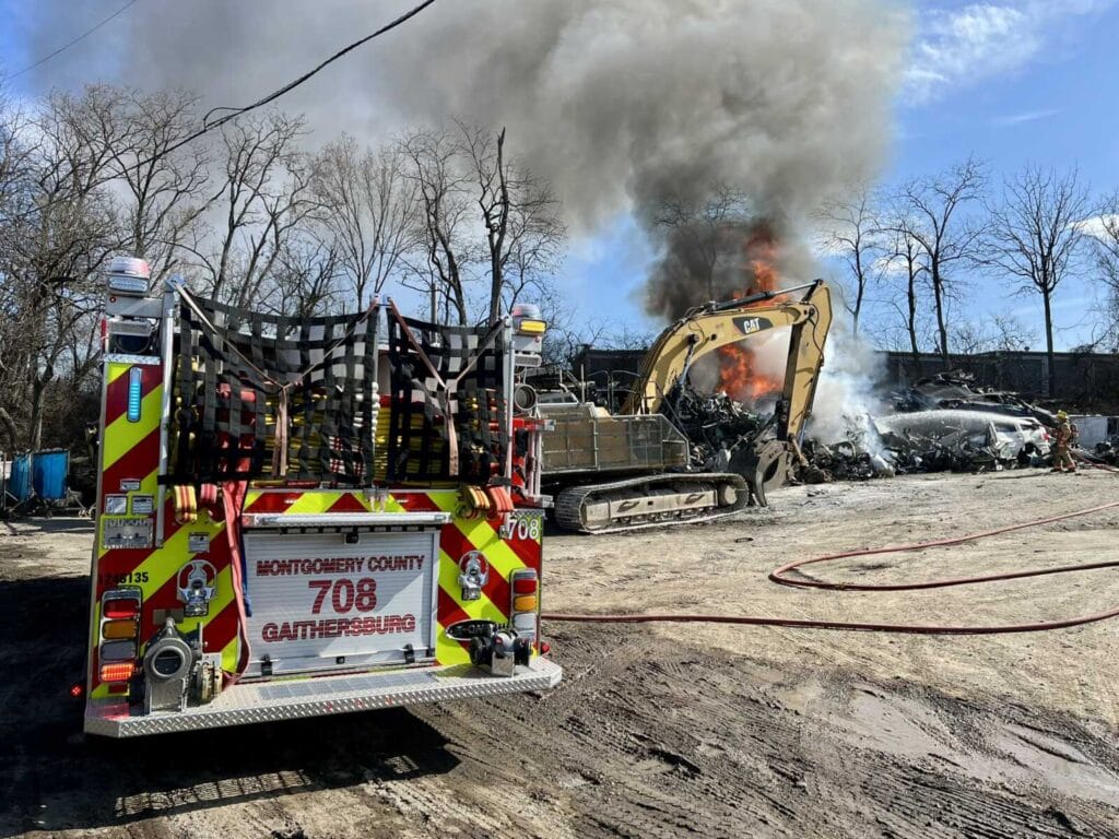 Montgomery County Los Servicios de Bomberos y Rescate (MCFRS) respondieron a un incendio en una pila de chatarra cerca de la intersección de Gude Drive y Dover Road en Rockville.