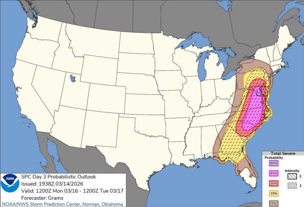 El Centro de Predicción de Tormentas sitúa actualmente a gran parte de la región en el Nivel 3 de 5, un nivel de “Riesgo Elevado” de tiempo severo. Esta designación significa que es probable que se produzcan tormentas más persistentes o generalizadas, y que varias de ellas podrían alcanzar intensidad considerable, incluyendo ráfagas de viento de al menos 120 km/h o tornados de categoría EF-2 o superior.