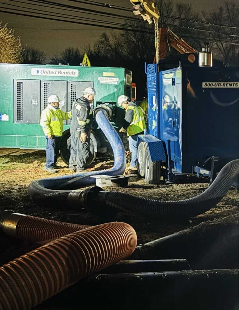 Los equipos de WSSC Water volvieron a trabajar durante la noche para excavar una tubería principal de alcantarillado de 30 pulgadas que se había derrumbado en 19111 Liberty Mill Road en Germantown mientras mantenían un sistema de derivación a gran escala para proteger a las comunidades cercanas y al medio ambiente.
