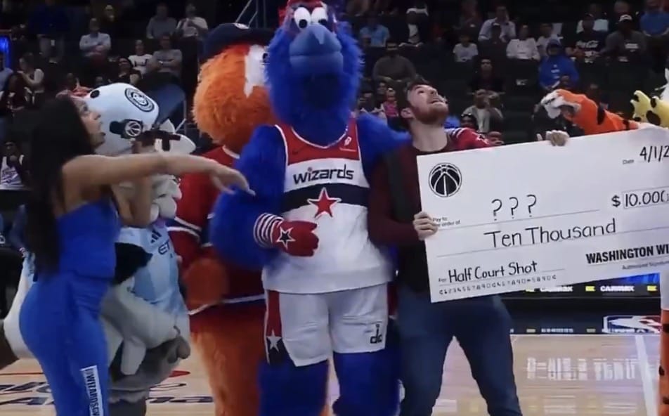 Durante el espectáculo, un aficionado con los ojos vendados entró a la cancha para realizar un tiro desde media cancha con la posibilidad de ganar 10.000 dólares. Tras el tiro fallido, el presentador, las mascotas y parte del público celebraron como si hubiera encestado. Incluso le entregaron un cheque simbólico de 10.000 dólares antes de mostrarle un vídeo que demostraba que, en realidad, había fallado el tiro.