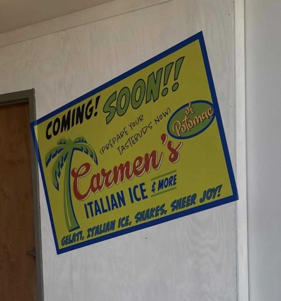 Ya está colocada la señalización de Próximamente. Helados italianos de Carmen en Cabin John Village en Potomac, ofreciendo la señal más clara hasta el momento de que la popular tienda de postres local está cada vez más cerca de abrir su nueva sucursal Montgomery County. Aún no se ha anunciado una fecha de apertura exacta.