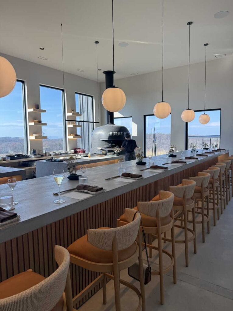 El restaurante The Chef’s Counter se centra en un menú degustación de 7 a 9 platos que refleja la interpretación de Strain de la cocina asiático-americana, con raíces en ingredientes de la región del Atlántico Medio procedentes directamente de Burnt Hill Farm y sus alrededores. El enfoque es intencionalmente equilibrado, combinando una técnica refinada con una sensación de comodidad y familiaridad. Como lo describe Strain, la experiencia es «reflexiva, pero no demasiado pretenciosa».