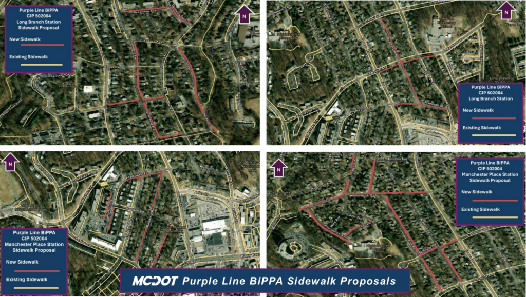 El Departamento de Transporte de DNT_2__ (MCDOT) organizará un taller público virtual el martes 14 de abril a las 6:30 p. m. para discutir las mejoras propuestas en las aceras alrededor de las futuras estaciones Long Branch y Manchester Place de la Línea Púrpura en DNT_55__.