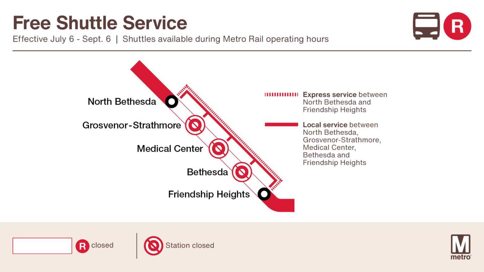Para facilitar el transporte de los pasajeros, Metro ofrecerá dos tipos de autobuses lanzadera gratuitos durante el cierre. Los autobuses lanzadera exprés circularán directamente entre North Bethesda y Friendship Heights en aproximadamente 26 minutos, mientras que los autobuses lanzadera locales pararán en cada estación a lo largo del tramo cerrado, con tiempos de viaje de aproximadamente 10 minutos entre paradas. Se prevé que los autobuses lanzadera circulen cada 5-8 minutos durante el horario habitual de funcionamiento.