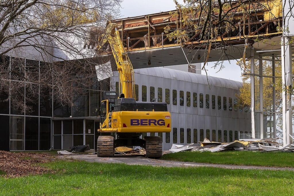 La demolición del antiguo edificio COMSAT en Clarksburg ya está en marcha, lo que marca el primer paso en la implementación del Plan del sector de acceso Clarksburg aprobado recientemente.