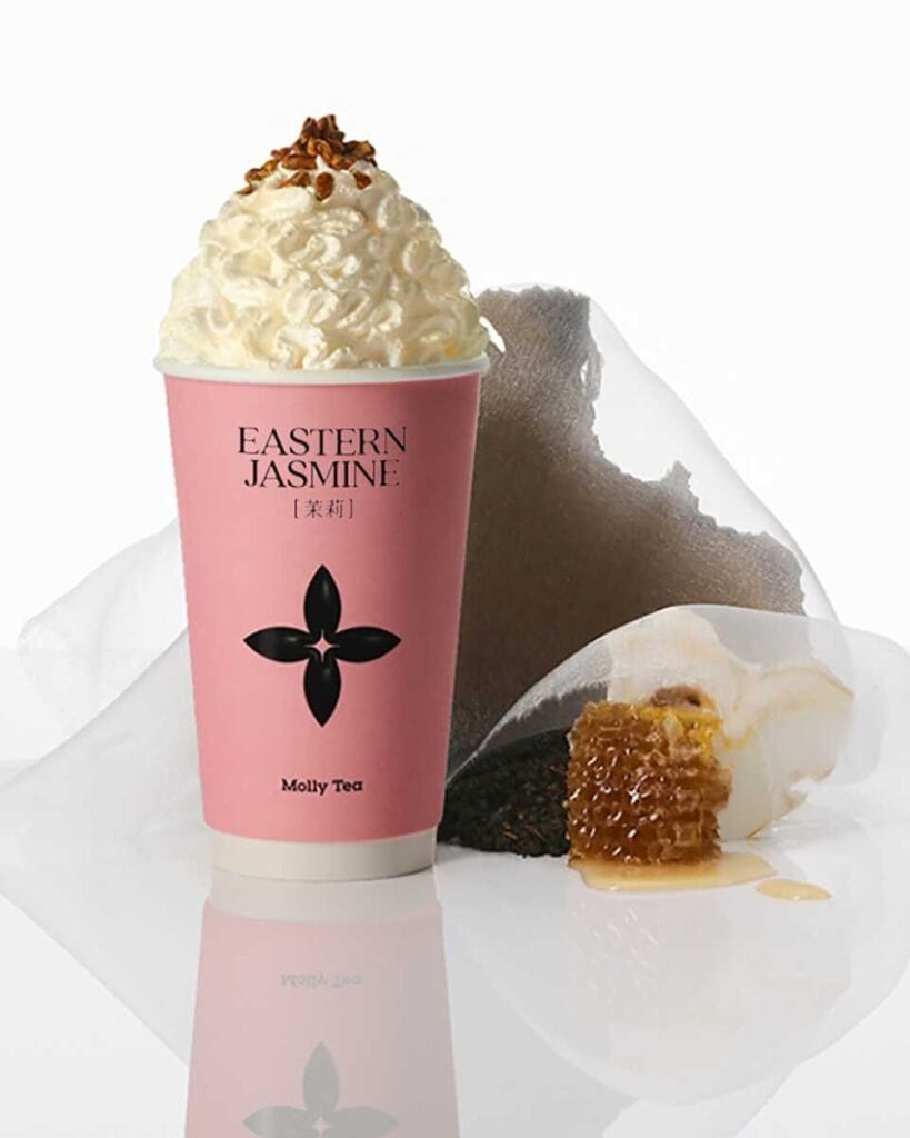 Según la empresa, Molly Tea se inspira en las “Cuatro Flores Blancas de Oriente” y se centra en el uso de hojas de té cultivadas en la montaña y perfumadas con flores frescas, especialmente jazmín. La marca destaca la importancia de mostrar la cultura del té chino a través de sus bebidas y su concepto general.